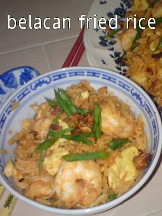 - Cook rice with belacan and fried shallots in a rice cooker. Allow to cool, fluff up rice, remove and keep rice in the refrigerator overnight if possible.