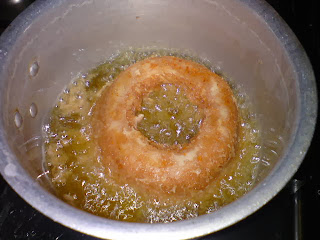 Instead of making just one yam ring, I made 3 smaller yam rings for easier frying, so that I don't have to use too much of oil. The yam rings do not look very fluffy cos' I reduced the vegetable shortening from 3 tablespoons to 2.