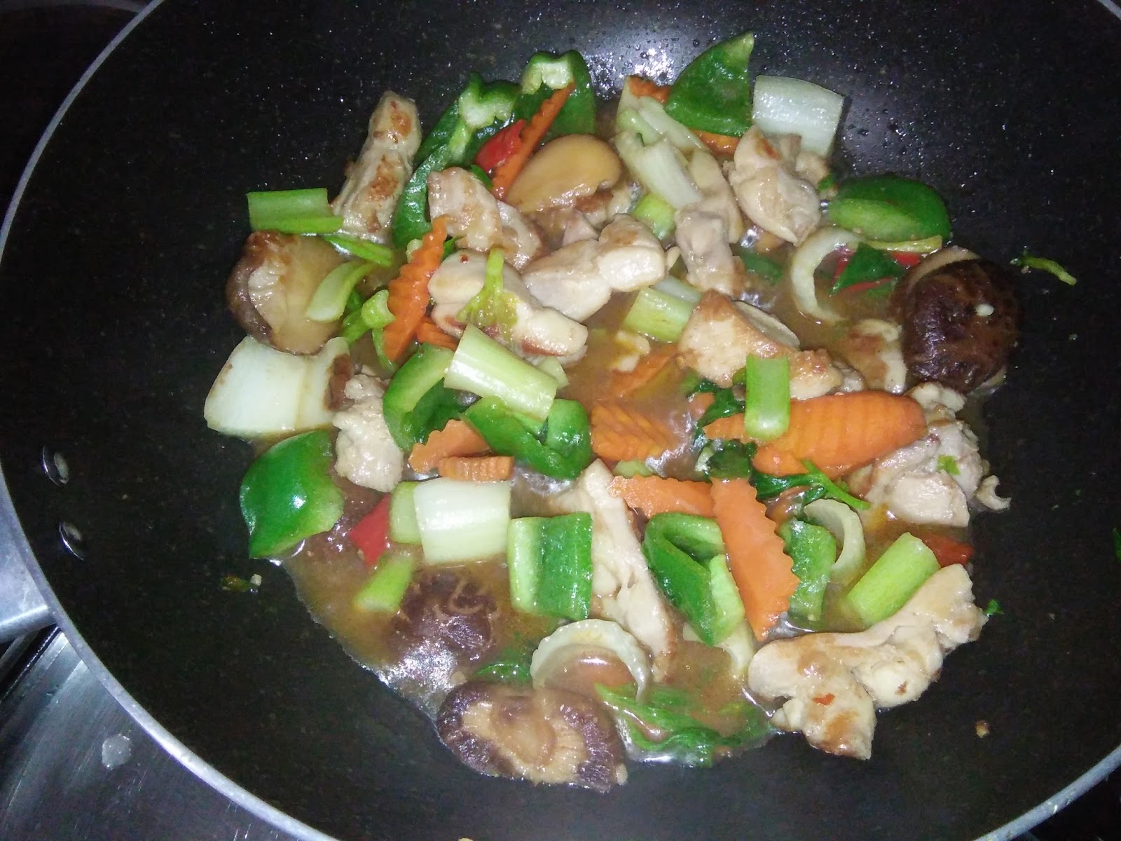 - Add in celery, seasoning, capsicum and red chilli. Add in taucheo and some water.